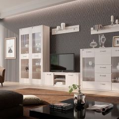 Гостиная «Элана» обязательно покорит любителей минимализма и сторонников практичности, ведь она может комплектоваться по Вашему желанию различными шкафами достаточной вместимости и полками, на которых удобно разместятся и важные мелочи, и элементы декора. Располагаться элементы гостиной «Элана» могут различным образом, что придаст помещению, в котором она будет находиться, неповторимый вид. А также добавить романтики в обычный вечер с помощью специальной светодиодной подсветки, которая может быть расположена в стеклянных полках.